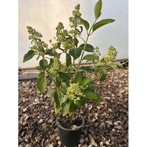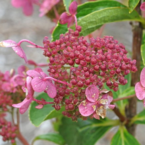 • Цветове: Ефирни, дантелени съцветия (lacecap). Започват като чисто бели през юни и постепенно се обагрят в наситено, тъмно розово до червеникаво.
